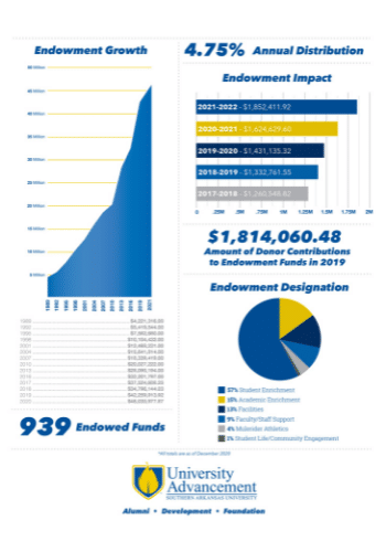 One of the greatest gifts you can give to SAU is creating or adding to an endowed fund. Endowments are conduits that allow alumni and friends to help the students of today and tomorrow. Endowments are a powerful investment in Southern Arkansas University’s future as they deliver a dependable, perpetual source of funding through the SAU Foundation. When you establish an endowment, the funds are invested instead of being spent immediately. Each year, a percentage of the return is made available to the University, directed toward the area of your passion.