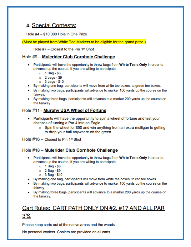 $500 per team (comes with 2 golf carts) or $125 for single players (comes with 1 golf cart)